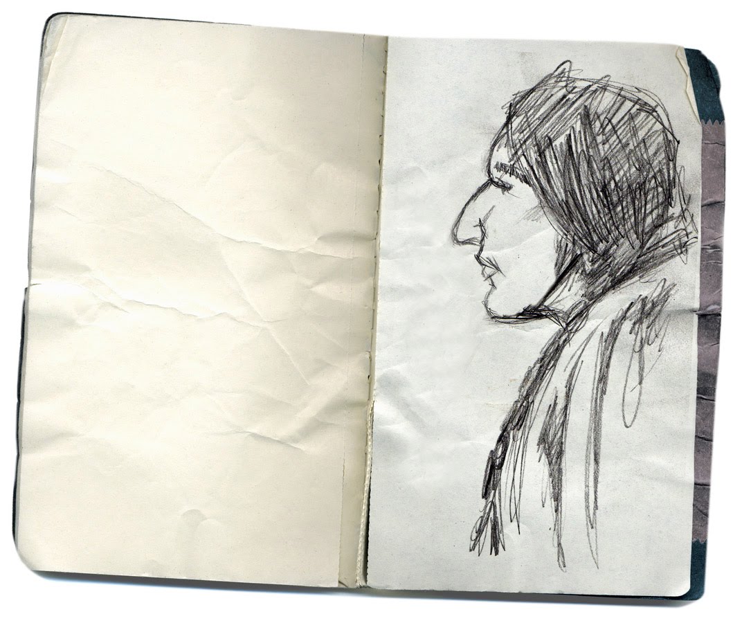 "I carry a sketchbook wherever I go. I'll use whatever is at hand - paper bags, hotel notepads, scraps - but usually I have a small leatherbound book, a brand which, unfortunately, is no longer made. When I heard that they were discontinuing them I bought a pile of them to tide me over... It looks like a bible more than anything else, and it fits neatly in my coat pocket. The paper inside is either antique white, or buff colored... and has a wonderful laid texture that will accept just